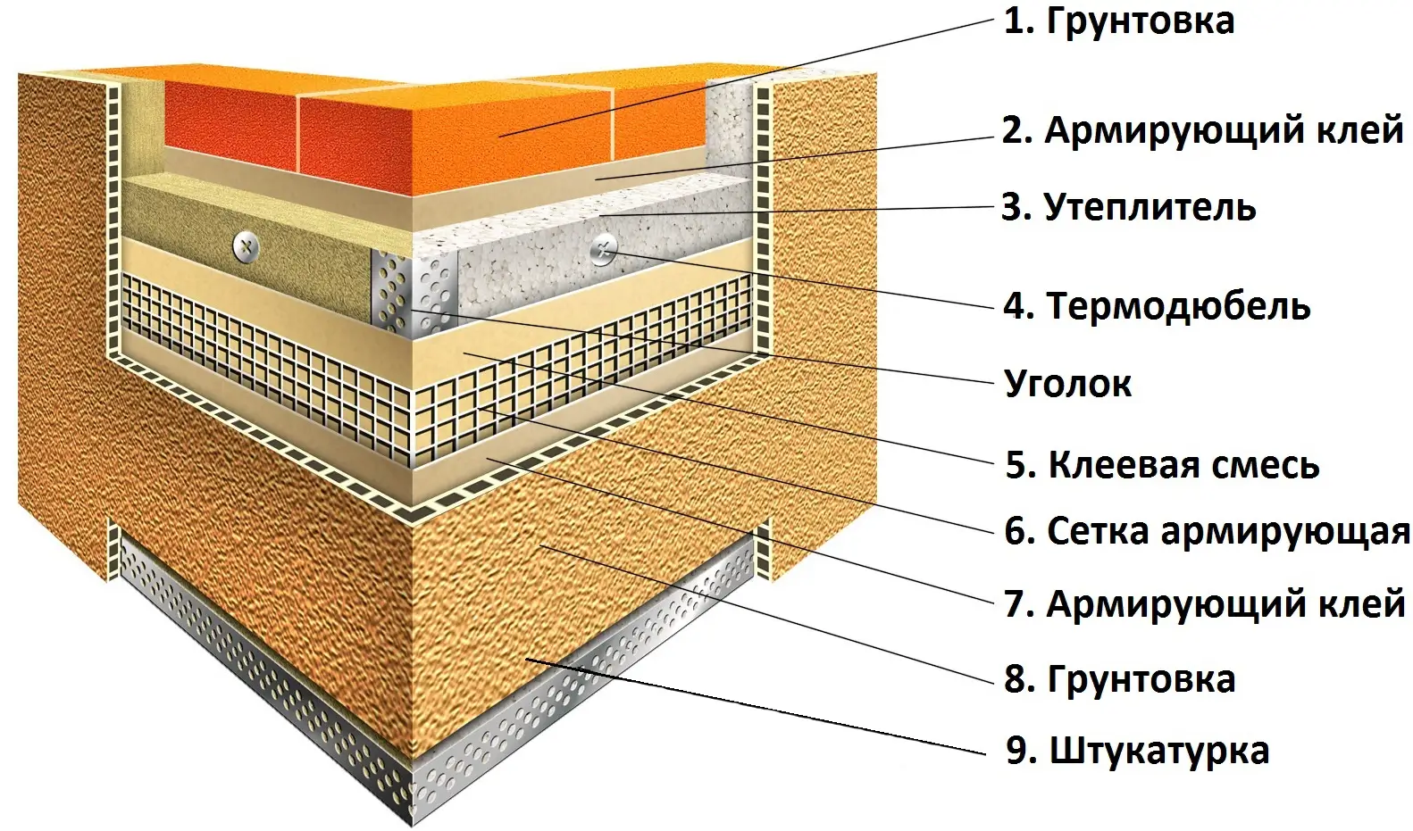 Качественное утепление фасадов пенопластом включает несколько этапов: